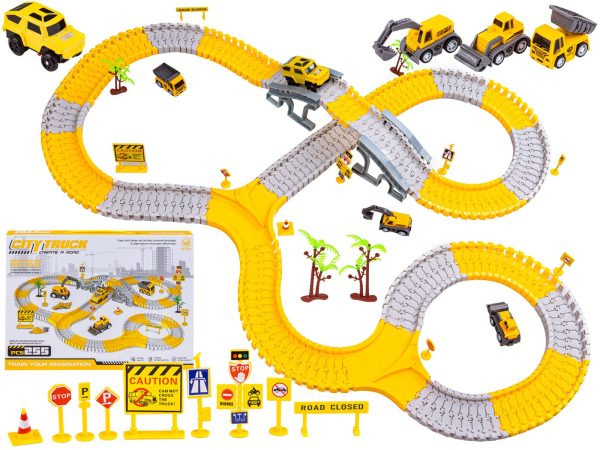 Zestaw oprócz głównego autka zasilanego, który porusza się bezpośrednio po torze wyposażony został w trzy resoraki. Każdy pojazd z kolekcji jest wyjątkowy. Jak na placu budowy tak i w naszym zestawie nie zabrakło koparki, wywrotki i walca. Resoraki posiadają ręczny napęd, który sprawi, że puszczone w ruch nie zatrzymają się szybko 🙂 Oto cała kolekcja – zaproś więc przyjaciół i bawcie się w najlepsze z tymi niepowtarzalnymi pojazdami.
