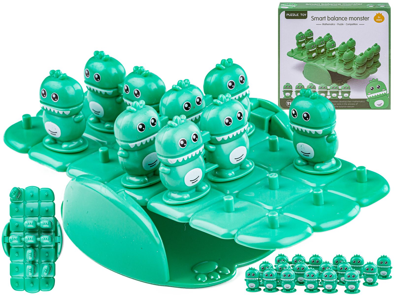 Spójrz, jakie wspaniałości kryje ta zabawka: równoważnia z uroczymi zielonymi stworkami oraz instrukcja z zadaniami, które zapewnią długie godziny ciekawej zabawy.