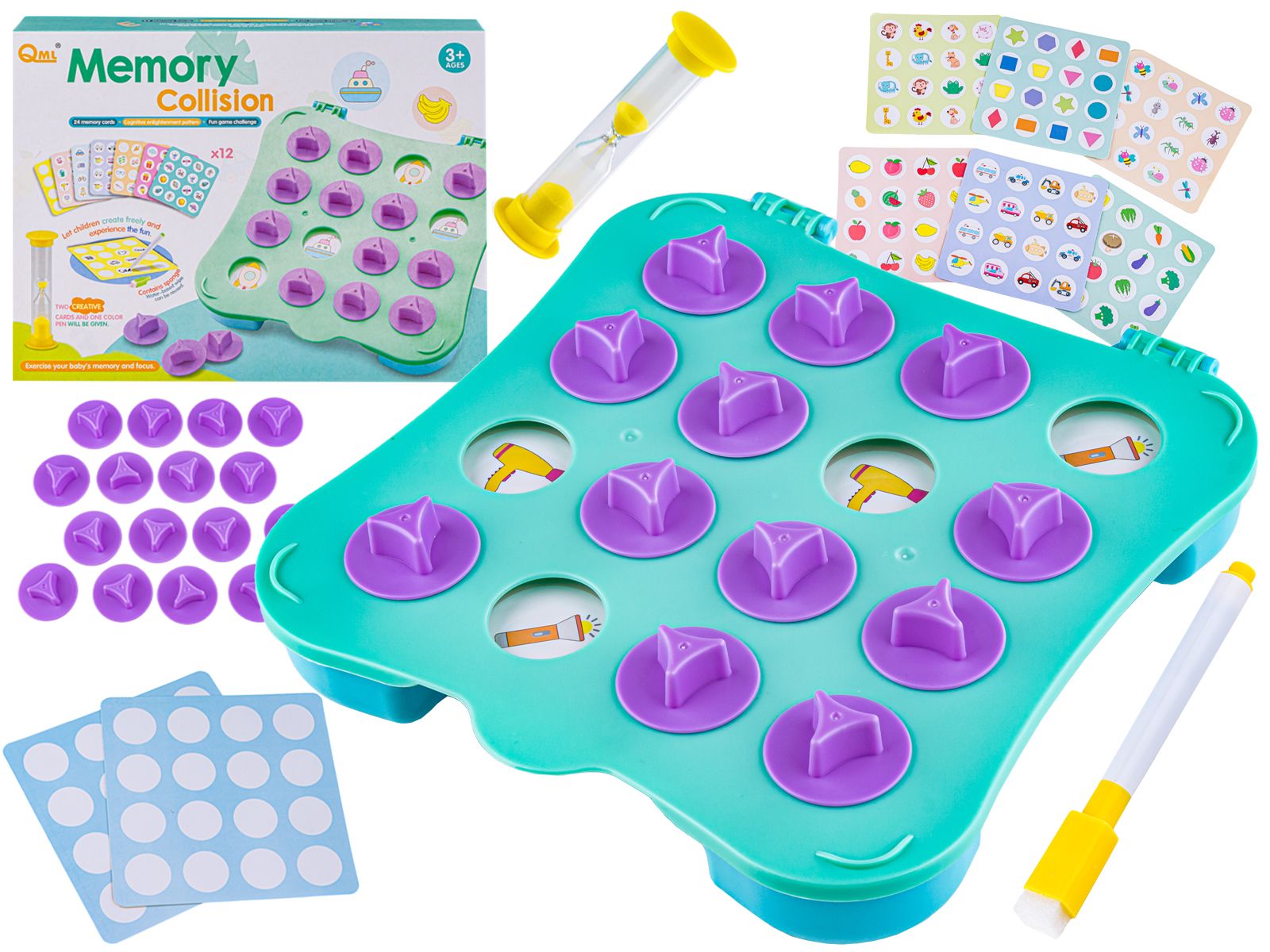 Zestaw zawiera podstawkę, w której umieszczamy wybrany przez siebie wzór obrazków. Wszystkie otworki na planszy zasłaniamy specjalnymi guziczkami. Grę rozpoczyna losowo wybrany uczestnik odsłaniając dwa guziczki. Jeżeli odsłonięte obrazki stanowią parę, to gracz zabiera guziczki i odsłania dalej. Jeśli nie trafi na kolejną parę – kolejka przechodzi na następnego gracza. Na koniec zliczamy zebrane guziczki – wygrywa osoba, która ma ich najwięcej. W celu podniesienia trudności gry można skorzystać z załączonej do zestawu klepsydry i odliczać nią czas do namysłu przy odsłanianiu obrazków 🙂