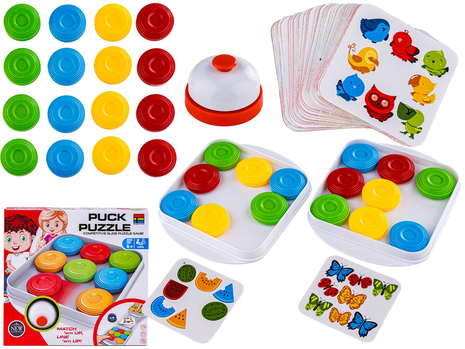 - Gra przeznaczona jest dla 2 graczy. Karty kładziemy na stole i odwracamy jedną z nich – tak aby była dla wszystkich dobrze widoczna. Celem gry jest jak najszybsze ułożenie układu z karty. Gracz, który jako pierwszy ułoży wybrany wzór dzwoni dzwonkiem i zabiera kartę. Ale uwaga: układ musi być identyczny jak ten na karcie, zgadzać się muszą zarówno kolory i umiejscowienie krążków 🙂 I co najważniejsze – w celu ułożenia wzoru nie możemy podnosić krążków z planszy – można nimi tylko przesuwać.