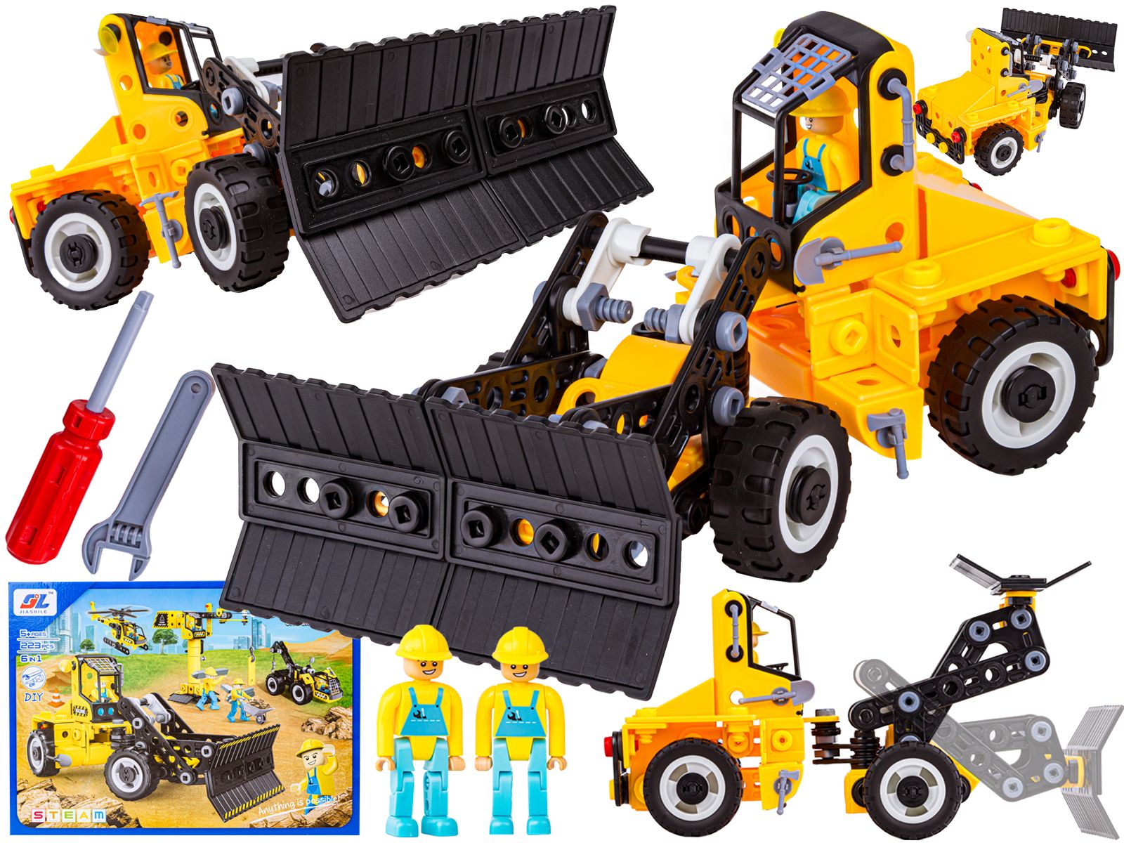 Klocki Konstrukcyjne 223 El. Maszyny, Pojazdy Budowlane, Spych, Helikopter, Dźwig Do Rozkręcania I Skręcania 6w1