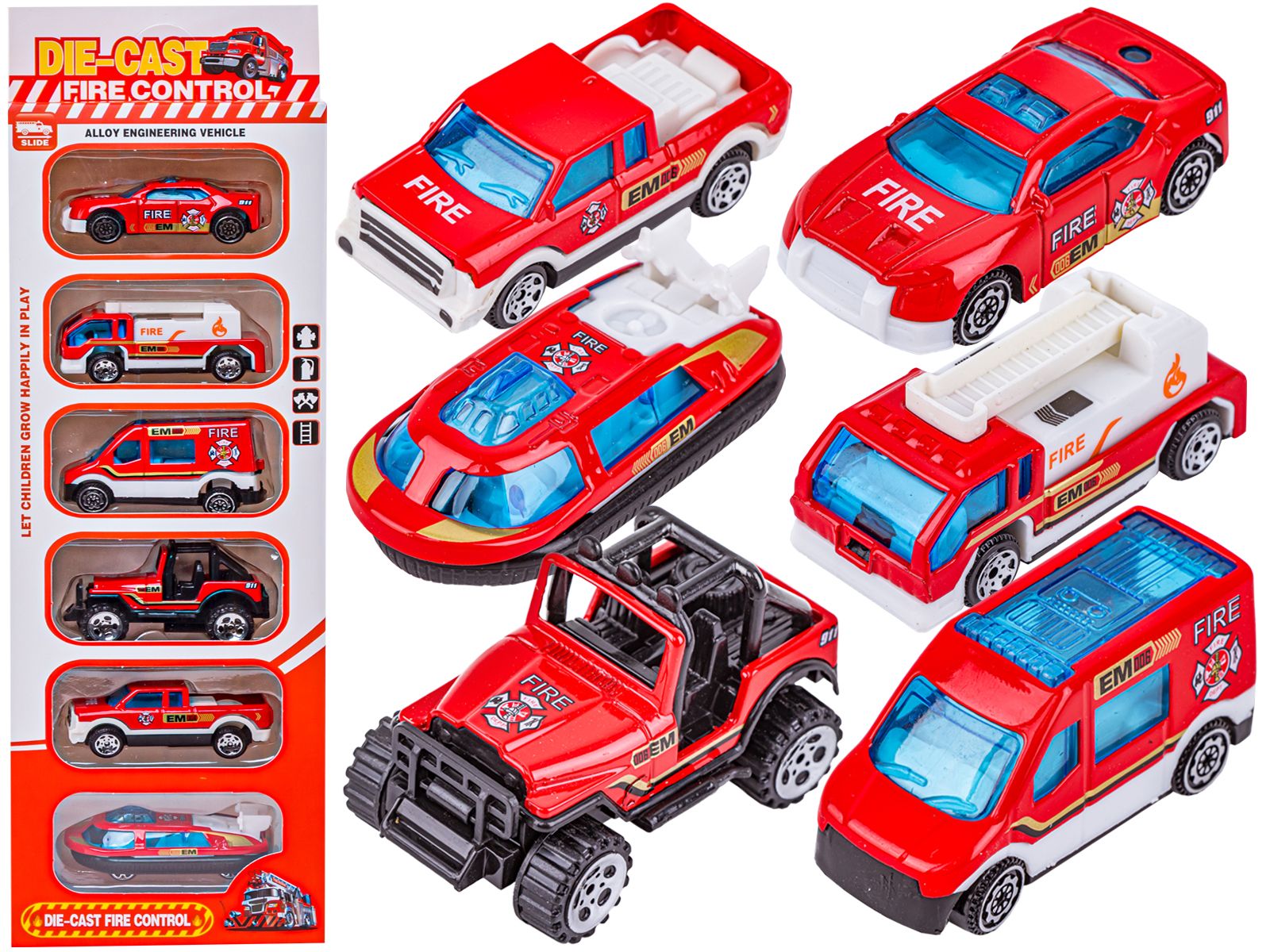 Każdy pojazd z kolekcji jest wyjątkowy. Zestaw zawiera oczywiście ciężarówkę z ruchomą drabiną oraz ambulans ratunkowy ale dodatkowo znajdziemy tutaj jeepa, pojazd terenowy (pick-up) oraz samochód osobowy a także – uwaga – poduszkowiec.
