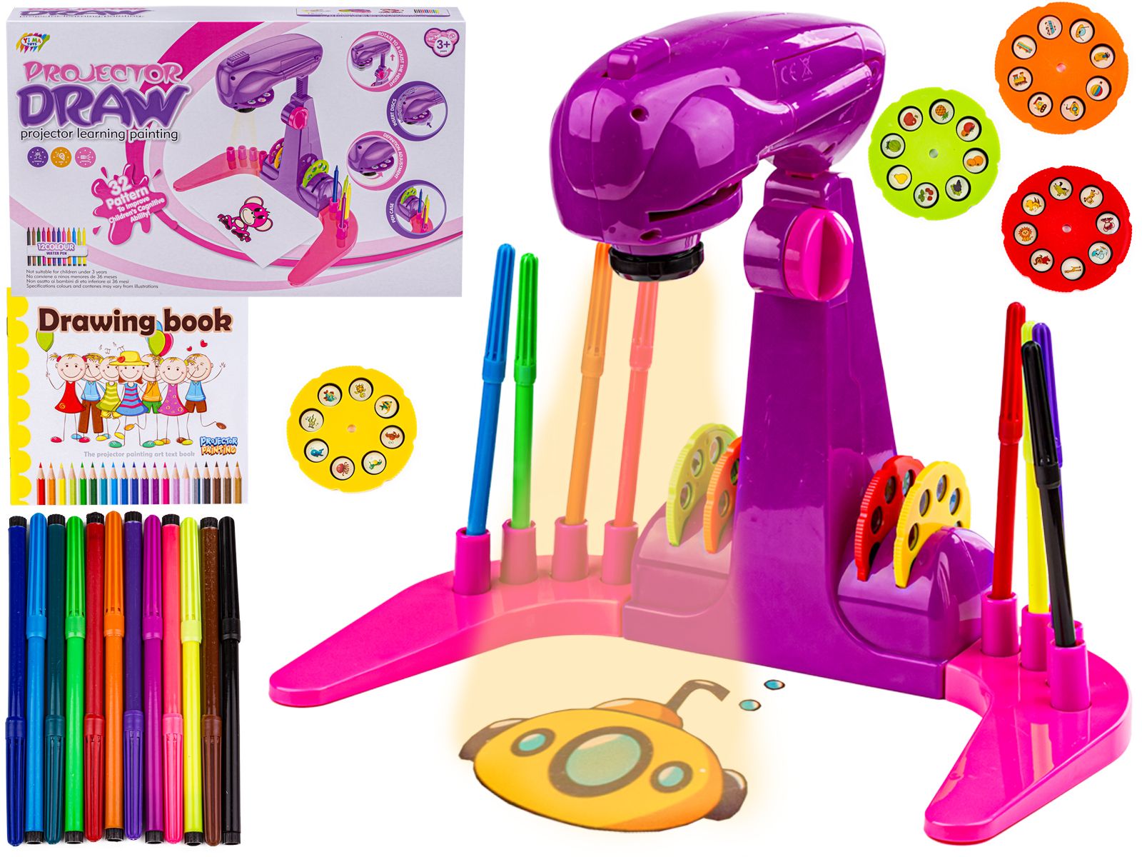 Wybrany wzór wyświetli się na podłożu. Wystarczy podsunąć kartkę do rysowania i rozpocząć przygodę z odrysowywaniem. Malowanie uprzyjemnią dołączone do zestawu kolorowe pisaki – aż 12 sztuk.