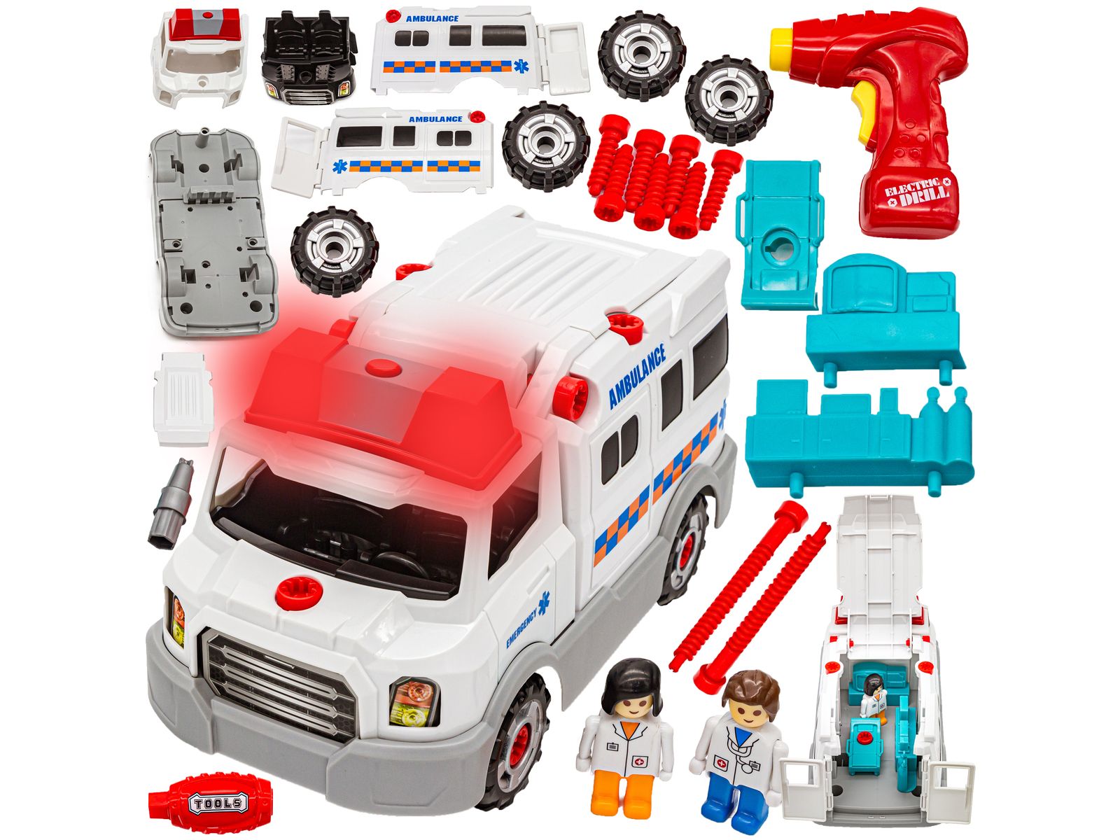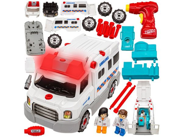 Rozkręcane pogotowie to idealna zabawka dla małych majsterkowiczów. Zestaw ten rozwija kreatywność, logiczne myślenie i zdolności manualne. W skład zestawu wchodzi mnóstwo części, m.in. koła, karoseria, śruby.