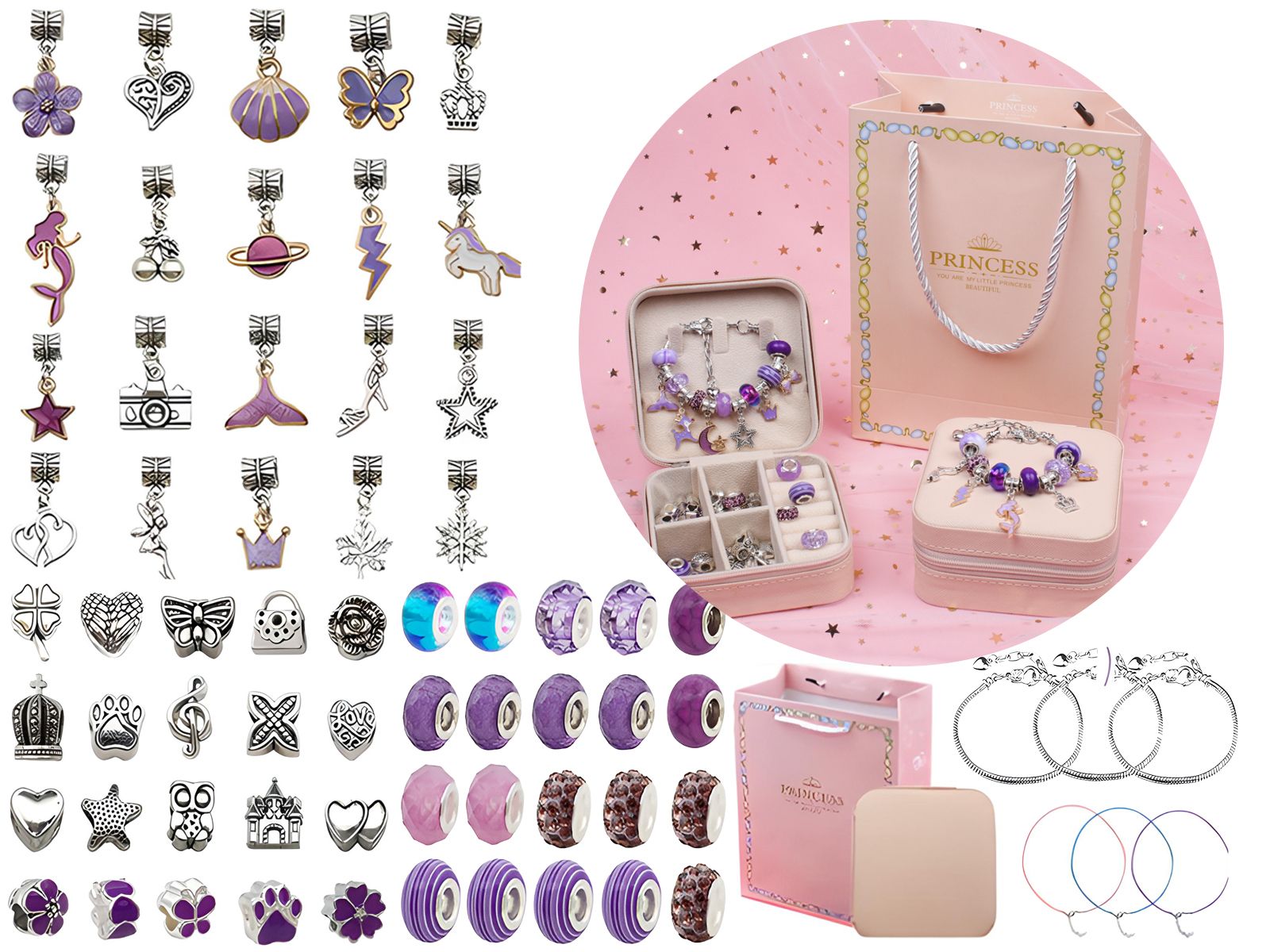 Zestaw Do Tworzenia Robienia Biżuterii, Bransoletek, Charmsy, Zawieszki, Koraliki ODCIENIE FIOLETU + Etui