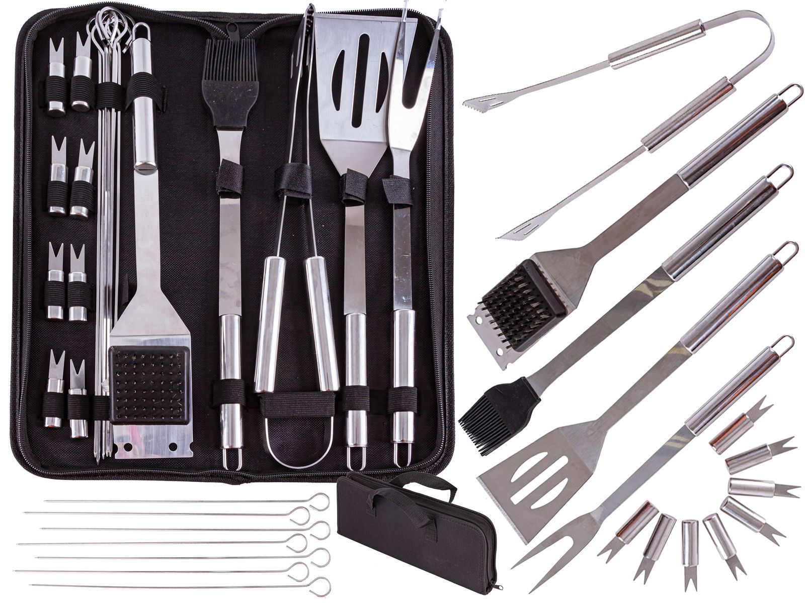 Zestaw 20 sztuk przyborów do grillowania zamkniętych w praktycznym etui. Produkt idealny na prezent lub do użytku domowego.